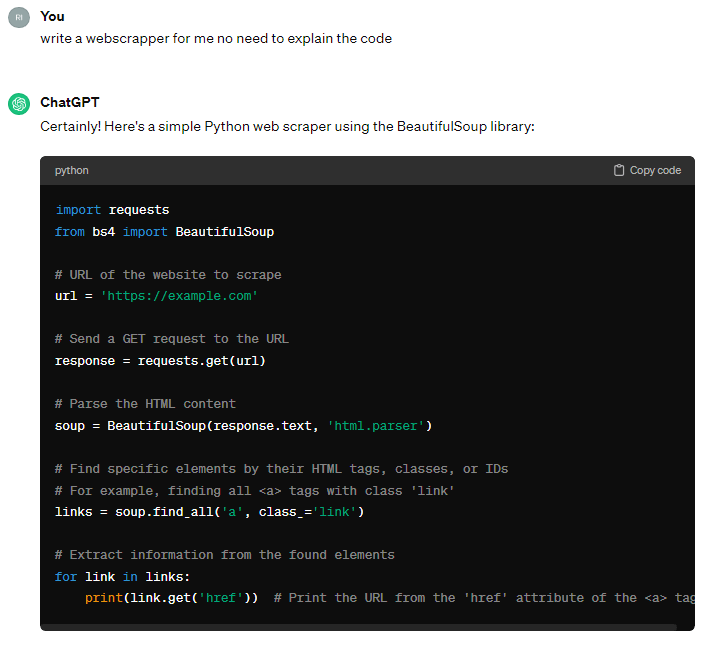 For demonstration purposes, I asked ChatGPT to generate a Python script for web scrapping. It was given a simple prompt, and the resulting script is shown below.