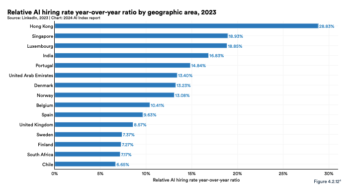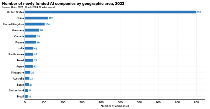 Focusing on GenAI, in 2023 there were 99 new Startups receiving funding, compared to 56 in 2022. As we know OpenAI changed the game making GenAI accessible to the mass market in 2022/2023 as it was still being developed (Figure 4.3.6 – Chapter 4.3 investment AI Index Report). Findings in the report showed that private investment in new Startups for GenAI has a huge regional disparity. The United States has outpaced the combined investments of China (0.65B) and EU & UK (0.74B) by approximately 21.07 billion (data). This is caused by the number of newly formed AI companies being predominately from the United States at a whopping 897 companies, and the next closest – China only at 122 and finally United Kingdom at 104. There is a clear disparity in how different countries are adopting the advancement of AI. The US has the infostructure and experience, thinking Google, Apple, Microsoft and more, who already have the base data infrastructure, data storage, chips for processing and technical skills to invest in smaller companies, whilst the UK is lagging behind in this department, however if we compare it to China who one might assume would be closer to the US, the UK is doing very well.