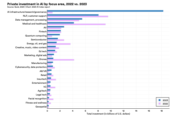 NLP and customer support, Medical and healthcare, Energy, oil and gas , drones, showed a major decline in AI investment in 2023, this could be caused by a number of factors. Let’s start with NLP and customer support, as we know there as been a shift to emerging AI technologies like GenAI which uses NLP and has better functionality for customer support. Another case is that NLP has now become standardised and incorporated into larger systems. For Medical and healthcare, there might be a pushback from market maturity and the area of focus for investments has changed since most processes within the medical and healthcare field have already reached their current peak stages for new funding, hence the huge drop in investment from 9.18 billion in 2022 to 4.2 billion in 2023 (data).