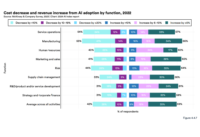 Let us now look at how cooperation’s are benefiting from the use of AI. From a report produced by Mckinsey & company survey in 2023 (collecting the cost decrease and revenue increase from AI adoption in 2022), it is found that manufacturing has had the biggest cost saving of 55%, followed by service operations at 54% then finally risk at 44%. For revenue gains the sector that benefited the the most were manufacturing at 66%, R&D at 61% although, R&D had the joint lowest cost decrease of 31% indicating that the R&D research was still unaffected by AI as much as other functions. In the case of manufacturing, according to monstarlab, AI has been effectively imbedded in a number of areas, ranging from manufacturing automation, supply chain and manufacturing control, to utilising data for pivotal business decisions. AI is touching all aspects of manufacturing that were very difficult in the past and helping it speed up its processes, in return, cutting costs and increasing production rate hence revenue increase.