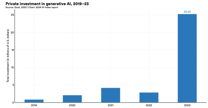 From data obtained by the AI index report, since 2021 corporate investment and private investment in AI have both been shrinking since 2021, however funding for generative AI (AI that can create its own contents across all mediums, think of ChatGPT) has been increasing at an astronomical rate. In 2022 the total investment in GenAI was 2.85 billion, which is dwarfed by the total investment in 2023 which scaled to 25.23 billion, a 885% increase, indicating businesses drive to harness GenAI (data). This doesn’t come as a surprise when we consider that ChatGPT came out in November 2022 and everyone and their grandmother could see the future altering potential that ChatGPT had unlocked.