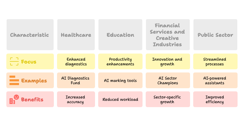 Financial Services and Creative Industries: Designated AI Sector Champions are tasked with fostering innovation, promoting initiatives such as AI-driven risk assessments in the financial services sector and automated content creation within the creative industries, thereby driving sector-specific growth and productivity.