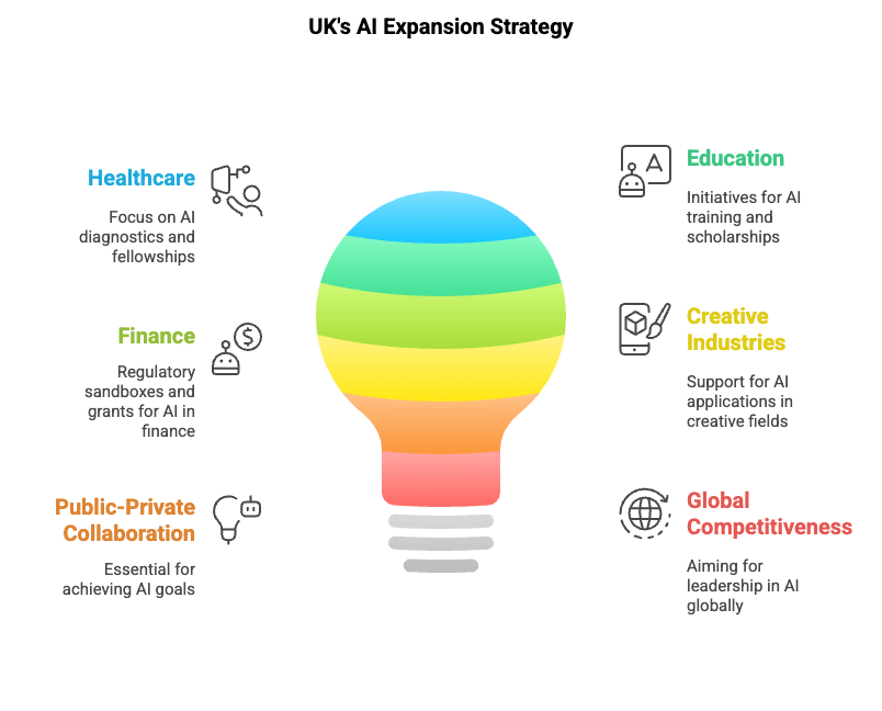 The UK’s vision is to leverage AI to drive economic growth, enhance public services, and compete globally. The AI Opportunities Action Plan is structured around expanding computational resources, targeting key sectors, and fostering innovation through regulatory flexibility. Below are the critical elements of this roadmap.