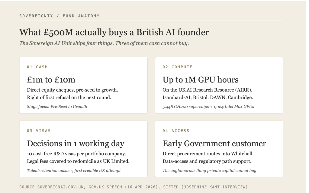 The Sovereign AI Fund, £500M committed, cheques from £1m to £10m, up to one million GPU hours per company. sovereignai.gov.uk