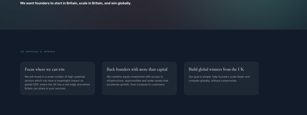 Start in Britain, grow in Britain, win from Britain. The Sovereign AI Unit’s own framing of the pitch, as published on sovereignai.gov.uk.